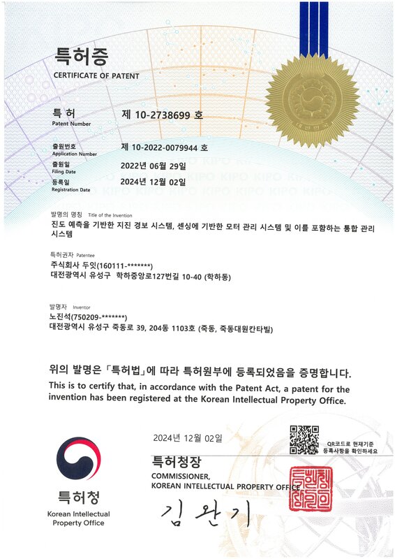 진도 예측을 기반한 지진 경보 시스템, 센싱에 기반한 모터 관리 시스템 및 이를 포함하는 통합 관리 시스템 / 10-2738699 A Earthquake Warning System Based On Seismic Prediction, A Motor Management System Based On Sensing And Integrated Management System Comprising The Same / 10-2738699